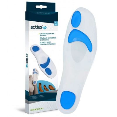 Plantillas fabricadas con silicona viscoelástica extrafina flexible, lo que permite una gran adaptación a la mayoría del calzado debido a su menor espesor, con apoyos metatarsal y calcáneo en diferente densidad y con apoyo retrocapital y puente.