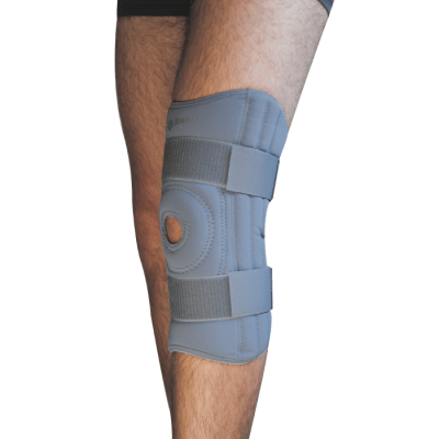 Ortesis de rodilla con orificio rotuliano, fabricada con algodón en su interior más estabilizadores laterales flexibles en aluminio y ajuste superior e inferior con cierre de contacto.