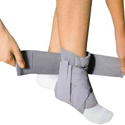Soporte de tobillo confeccionado en lona con férulas de PVC laterales removibles, ajustable con cordón y banda de cruce con cierre de contacto.